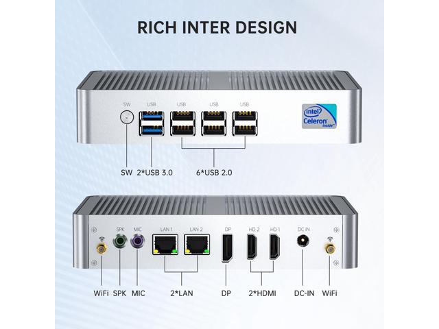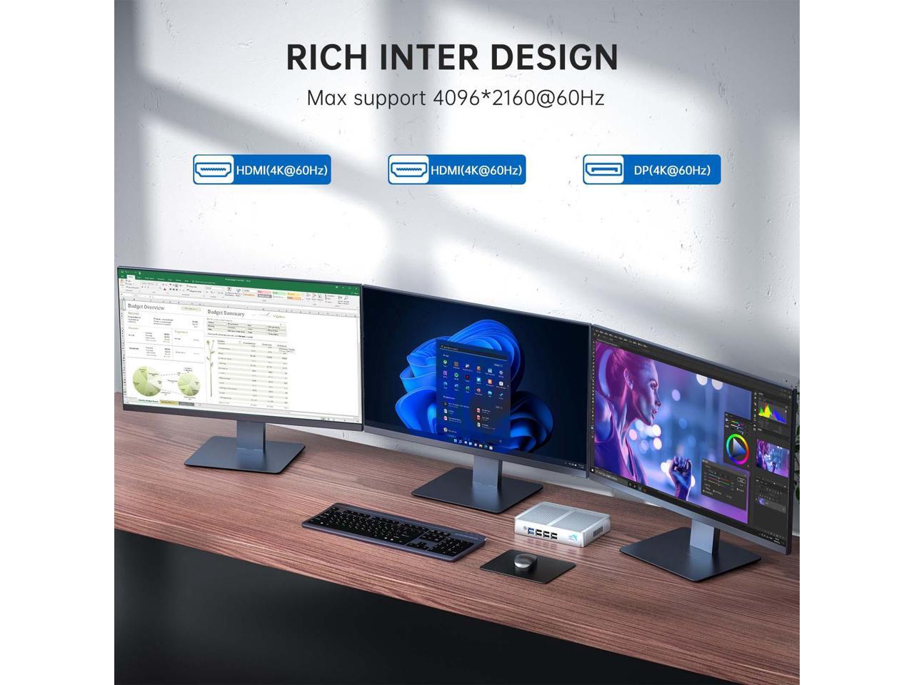 - Triple Screens Display & 4K@60Hz SupportHDMI(4K@60Hz)×2,DP x 1 ( 1*DisplayPort and 2*HDMI can output video signal at the same time) . This Mini PC supports multiple device connection and can be used with servers, monitoring equipment, office equipment, displays, projectors, televisions, etc.
