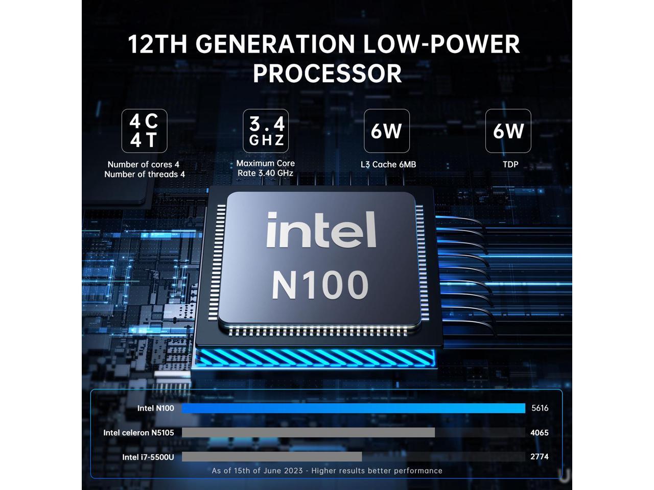 - Powerful Performance Mini PCThe 12th Intel Alder Lake N100, 7nm process, 4 cores, 4 threads, up to 3.4GHz. More powerful performance and smoother running than J4125/N5095/ N5100/N5105. Ideal for office work, on-the-go, home entertainment, smaller size and lighter weight than a desktop compute.