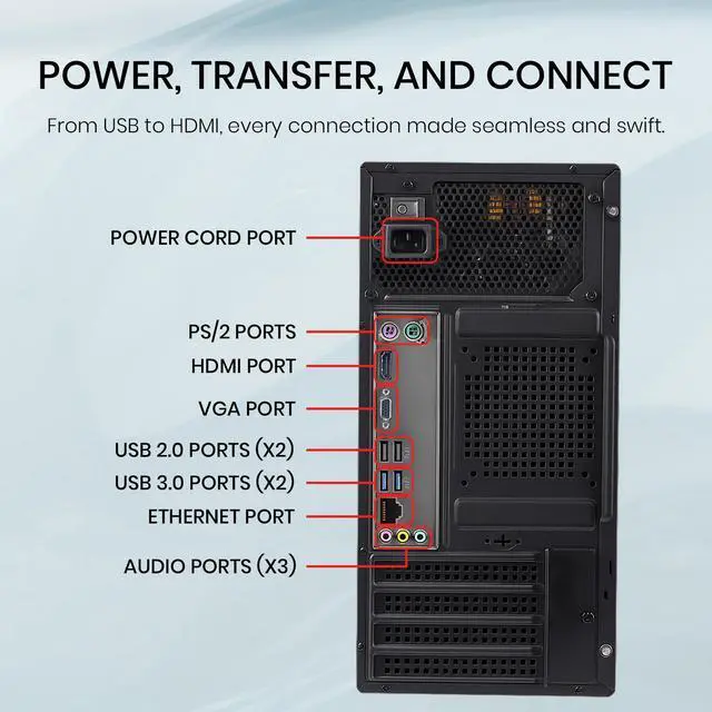• COMPREHENSIVE CONNECTIVITY- Features multiple USB ports including USB 3.0 and USB 2.0, Type-C port, HDMI and VGA video outputs, Ethernet port, audio ports, and PS/2 ports for versatile peripheral connections.