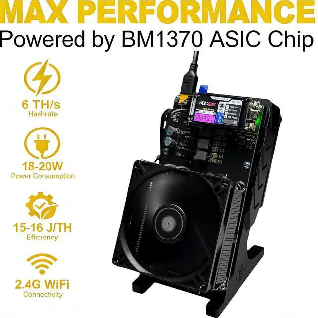 Maximize Profit, Minimize Power: Equipped with four industry-leading BM1370 ASIC chips (6 TH/s each), the NerdQaxe++ delivers a total hashrate of06 TH/s, optimized exclusively for SHA256 Bitcoin mining. With an exceptional power efficiency of 1516 J/TH and an operating consumption of just100W, it achieves the perfect balance between high performance and low energy useideal for 24/7 home mining without excessive electricity costs.