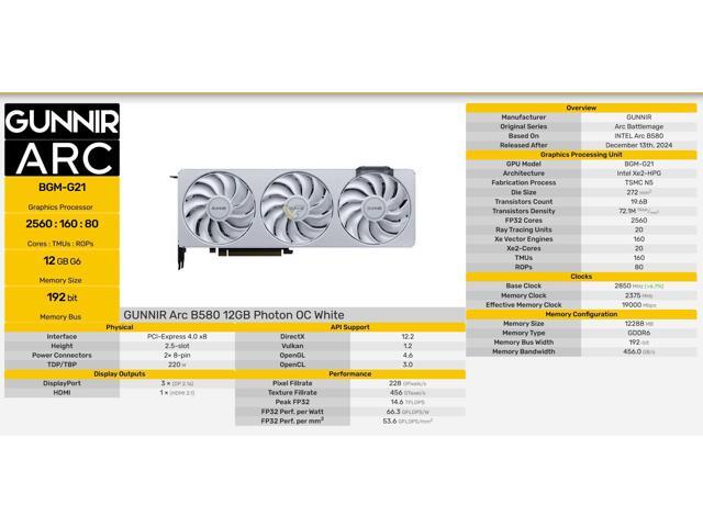 - Powerful Graphics: The GUNNIR Intel Arc B580 Photon features 12GB of GDDR6 memory clocked at 2850MHz, delivering exceptional performance for gaming and content creation.