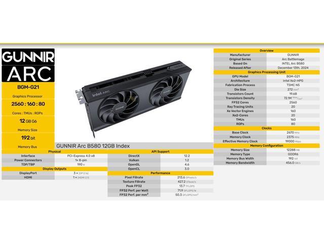 - Powerful Graphics: The GUNNIR Intel Arc B580 Index features of 12GB GDDR6 memory clocked at 2670MHz , delivering exceptional performance for gaming and content creation.