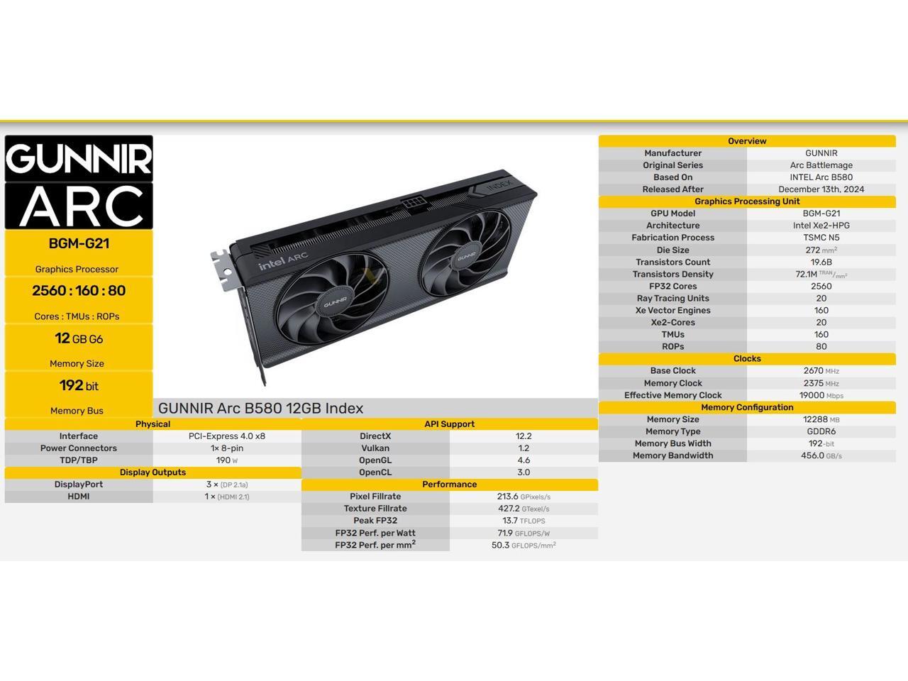 GUNNIR Intel Arc B580 Index Video Card 12GB Black GDDR6 2670MHz Dual Fan Graphics Card (192-bit, PCI-Express 4.0 x8, One HDMI Three DisplayPorts, Supports 4k)