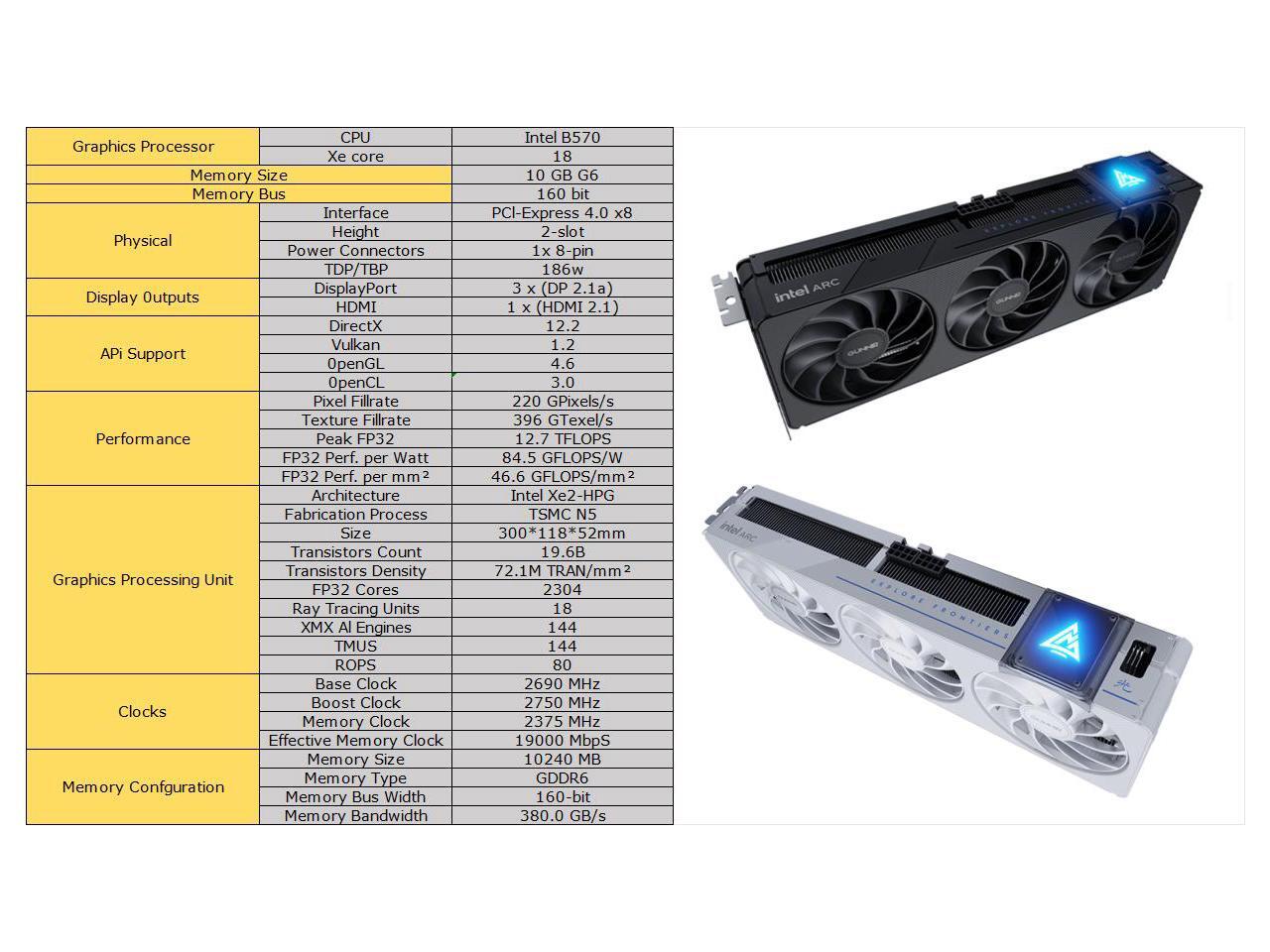 - Powerful Graphics: The GUNNIR Intel Arc B570 Index features of 10GB GDDR6 memory clocked at 2500MHz , delivering exceptional performance for gaming and content creation.