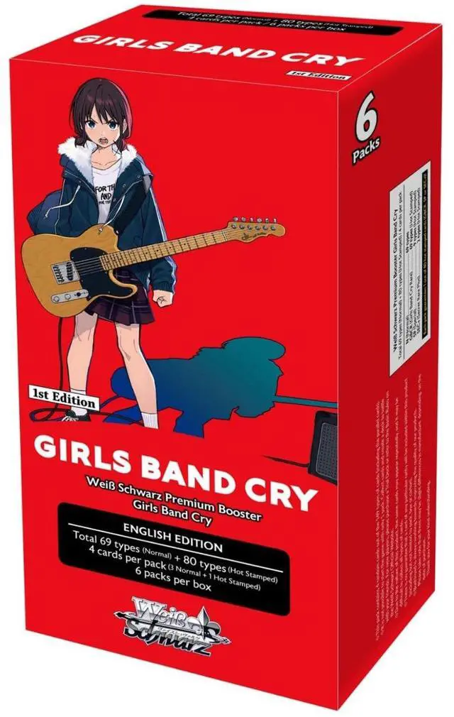 The band members from the TV anime "Girls Band Cry" arrive on the stage of Weiss Schwarz! Offering fans and players a unique way to enhance decks and collections. This booster box contains six booster packs, with four cards each. Each pack contains 3 normal cards and 1 Hot Stamped. You'll get a chance to pull special cards that feature character signs from the members of "TOGENASHI TOGEARI" and "DIAMOND DUST", and a SEC+ card that features hot-stamped signs from the creators of the series.
