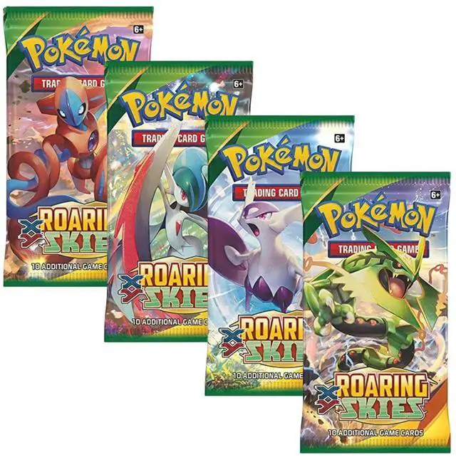 Complete your sealed collection with the Roaring Skies booster art set, featuring one pack of each pack artwork from the classic XY expansion. Released in 2015, Roaring Skies became one of the most memorable sets of the era and remains popular among collectors today. This listing includes four sealed booster packs showcasing the full artwork lineup, including designs featuring Mega Gallade, Deoxys, Mega Rayquaza, and Mega Latios.