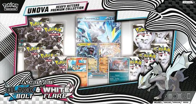 From awe-inspiring Legendary and Mythical Pokmon to a tricky master of illusions, Pokmon from the Unova region boast all sorts of strengths! Inside this collection, you'll find playable foil promo cards featuring Zekrom ex, Reshiram ex, Victini, and Zoroark, plus an oversize foil promo card of Kyurem ex for display. Even more Pokmon from the Unova region await inside a total of 12 booster packs from the special Scarlet & Violet-Black Bolt and Scarlet & Violet-White Flare expansions.