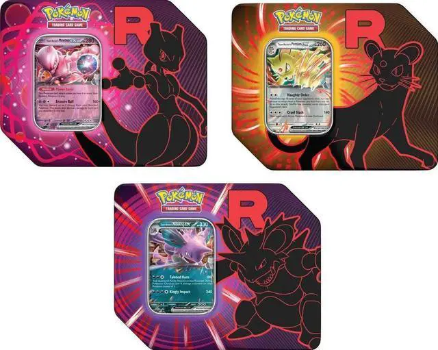 This Pokmon TCG: Team Rocket Tin includes: ? 1 foil promo card featuring Team Rocket?s Mewtwo ex, Team Rocket?s Nidoking ex, or Team Rocket?s Persian ex ? 5 Pokmon TCG booster packs ? A code card for Pokmon TCG Live