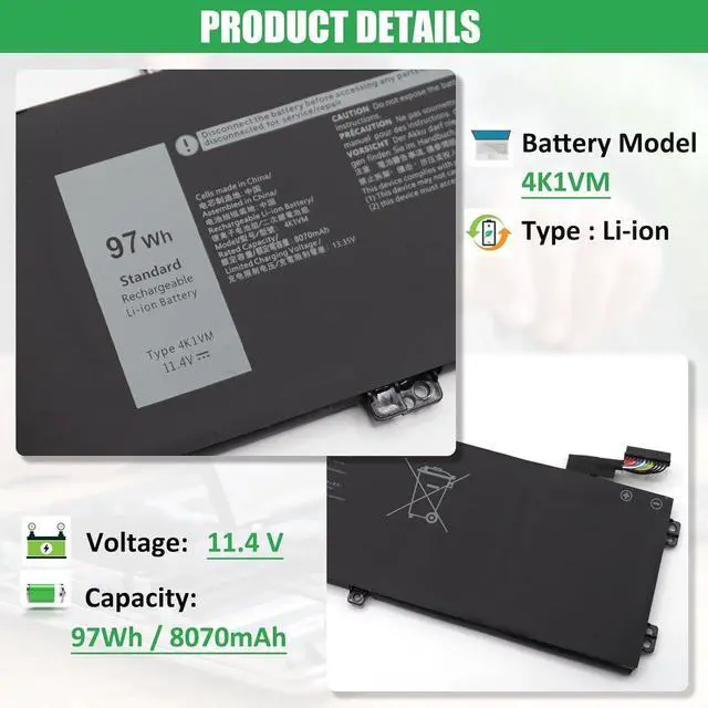 Battery Specification: Model Name: 4K1VM; Voltage: 11.4V; Capacity: 97Wh / 8070mAh; Battery Type: Li-ion; Condition: 100% brand new from manufacturer; Color: Black; Packaged come with: 1*battery + battery installation screwdrivers + 1*instruction for laptop battery