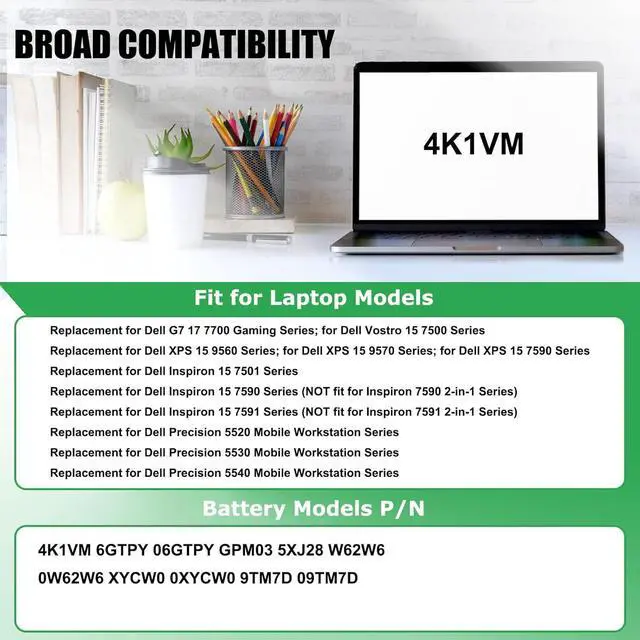 Compatible Laptop Models: Replacement for Dell G7 17 7700 Vostro 7500 XPS 15 9560 9570 7590 Inspiron 7501 7590 7591 Precision 5520 5530 5540 Mobile Workstation Series. (Note: NOT fit for Inspiron 7590 2-in-1 Series, NOT fit for Inspiron 7591 2-in-1 Series)