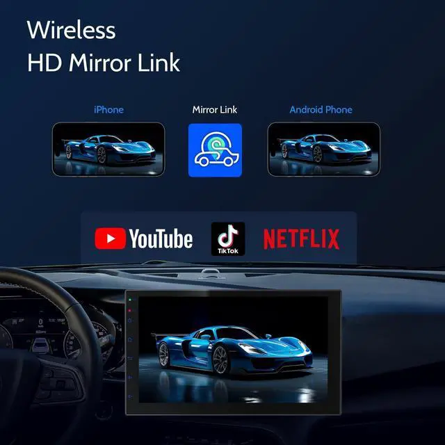 Wired and Wireless CarPlay & Android Auto with Voice Control The double din car stereo supports wireless apple car play and android auto. Connecting Phone wireless automaticly, as soon as you start the car. You can get directions from GPS navigation apps from phone link like Google Maps and Waze, planing the route for you, put on your personal playlist on Spotify (from phones), have Siri / Google Assistant (from phones) call a friend, etc. ^^ Immersive 7-Inch IPS Touchscreen& Wireless Mirror LinkSupports IOS & Android phone for mirror link function, use the Wireless Mirror Link connection to mirror the screen of your smartphone and show Google Maps, Spotify, Youtube etc.