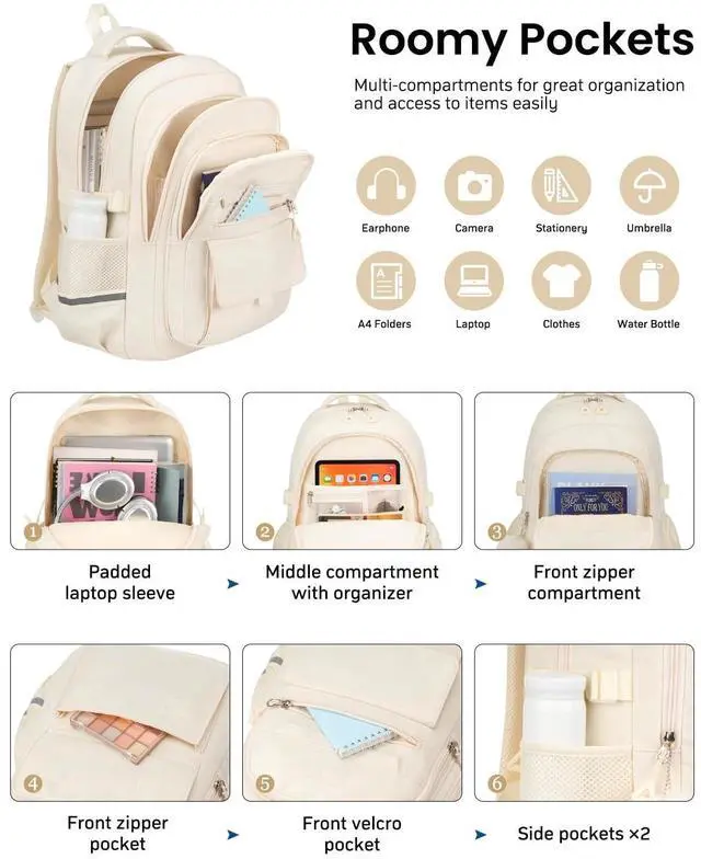 Pack It All In: Simple & convenient design, 15.6" or 17.3" laptop sleeve, 1 huge main compartment for A4 folders, books and lunch box, middle pocket with organizer, 3 front utility pockets, 2 side pockets and a back anti-theft pocket. Whether your carrying textbooks, tech gadgets, or travel essentials everything has its place within this versatile pack ^^