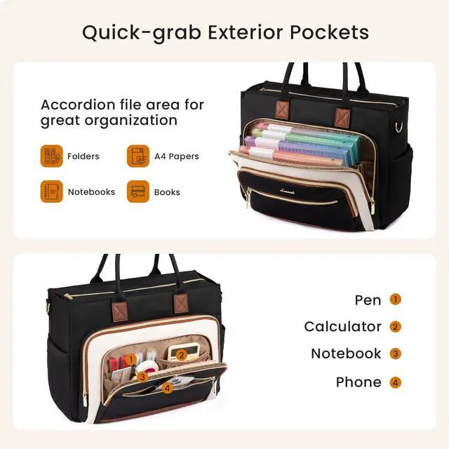 • Professional Accordion File Organizer Stay organized with this tote bag for work featuring a handy accordion file organizer with 4 compartments for A4 documents, books, or lesson plans. Its sturdy design keeps papers tidy, while the lightweight build makes it perfect for on-the-go. A must-have for work bags for women who need efficiency!