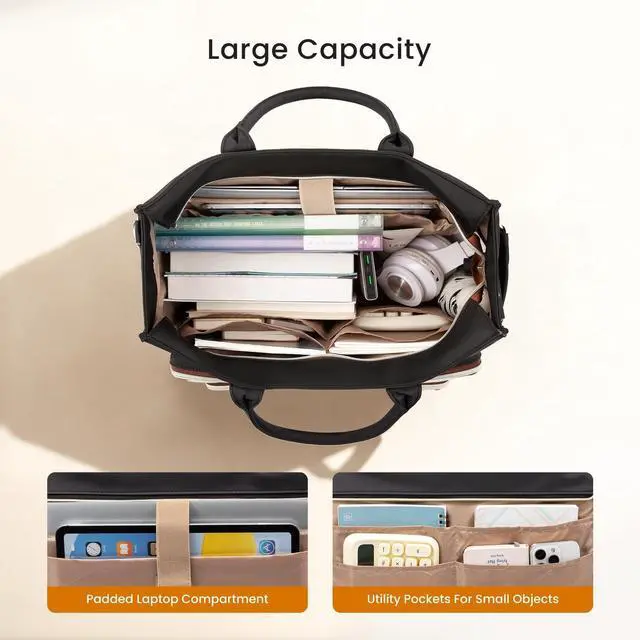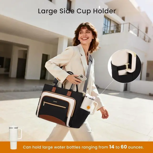 A must-have for work bags for women who need efficiency! ^^ Large Cup Holder Designed with a stretchable side pocket that accommodates 14-60 oz water bottles, this work tote bags for women ensures spill-proof convenience. The reinforced stitching and durable fabric make it ideal for teachers nurses, or moms using it as a diaper bag. ^^ Computer Compartment + Large Capacity This laptop bag for women includes a padded 15.6 -inch computer compartment and a high-capacity main section for books/files. Multiple interior pockets organize pens/phones, while reinforced handles add durability. Suitable as a teacher tote bag or work tote bag for women, it meets all work needs.