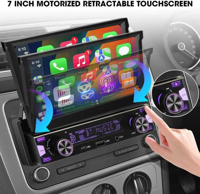 Adjustable Motorized Pop-out Monitor: With push of a button on the panel, the large 7 inch carplay touchscreen slides out automatically and fluently, you can enjoy crystal HD IPS display with responsive touchscreen control and you can adjust the car screen angle to deal with the glare from the sun. The rotary control knob for volume adjustments ^^