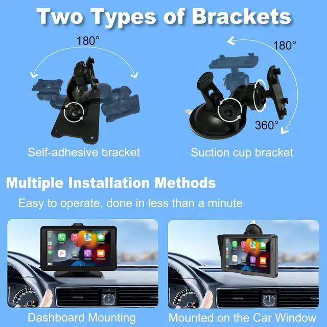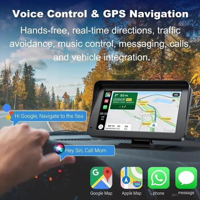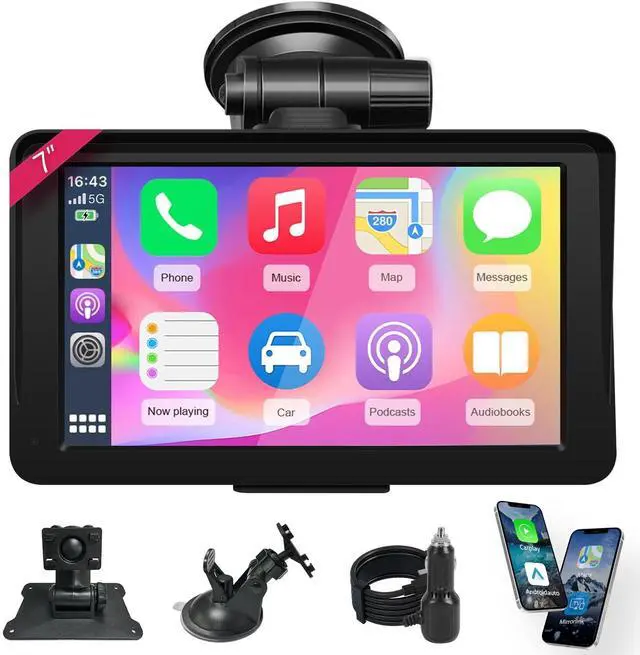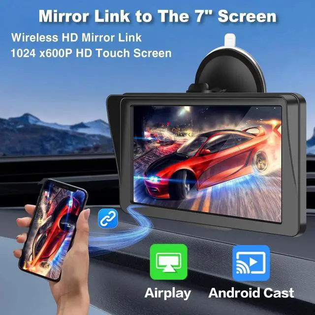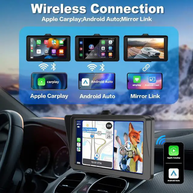 Wireless Apple Carplay & Android Auto with Voice ControlEnjoy seamless smartphone integration! This portable carplay screen supports Wireless Apple Carplay and Android Auto, allowing you to access maps, music, calls, and apps like Spotify or Waze directly on the 7" HD touchscreen. Control everything hands-free via Siri or Google Assistant, ensuring safer driving. Apple car play perfect for older cars needing a modern tech upgrade without replacing the factory stereo. ^^ 7" HD Touch Screen with Mirror Link & GPS NavigationThe 7-inch HD IPS Carplay Screen for Car offers crystal-clear visuals for navigation, videos, and smartphone mirroring.