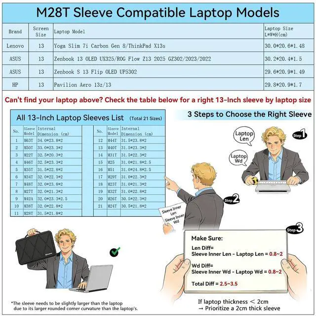 Splash-Resistant: the smatree sleeve is made of durable 280g nylon lycra, it obstructs water effectively. Don't worry about splashing water, washable when laptop sleeve case becomes dirty ^^ Smatree Pioneering Custom-Sized Protection for Every Laptop. Over 100 precision-fit sizes engineered for 2, 000+ laptop models. If you're not sure which model of sleeve is fit for your laptop, please check the Product Description. We provide a sleeve model list for most 13-inch laptops; check it to find your ideal fitting sleeve.