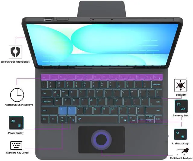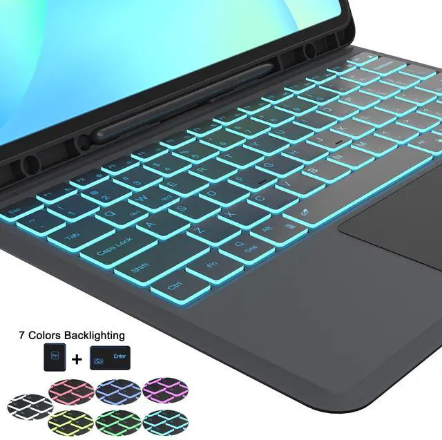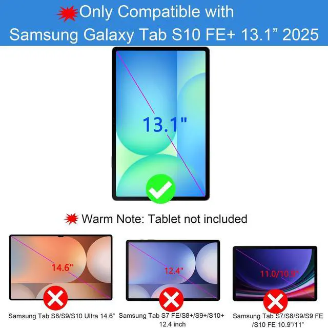 Warm Note: Tablet and stylus are not included, just kindly check your tablet model before purchasing: Go to tablet Setting- About tablet-Model name ^^ 7 COLORS BACKLIT KEYBOARD - The tablet case with keyboard for Samsung Tab S10 FE Plus designed with 7 colors backlights and 3 level brightness adjustable, make it easy to type in any dim condition. QWERTY US layout keyboard as the familiar laptop keyboard, type comfortably and accurately with a full row of shortcut keys, you can maximize your productivity on the go, day or night, anytime, anywhere ^^ MUTIL-TOUCH TRACKPAD - The new ergonomic Galaxy Tab S10 FE Plus keyboard case with trackpad uses the familiar multi-gesture, control the tablet with precise touchpad responsive control of your Tab S10 FE+ tablet navigation without needing an extra mouse, Multi-touch trackpad allowing you to Use it like a laptop to edit documents, navigate applications and build presentations with unmatched speed, precision and accuracy ^^ MUTIL-VIEWING STAND & S PEN HOLDER - This tablet keyboard case for Samsung Galaxy S10 FE+ with S pen holder & Adjustable kickstand, allows you to easily use your Samsung tablet to type, note, watch videos, etc. Help you enjoy a comfortable posture for work or viewing, hands-free and built in Pen slot for easy storage of pens to avoid losing.