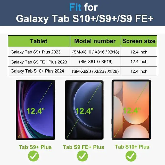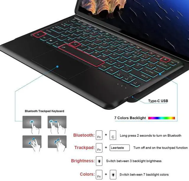 CompatibilityExclusively designed for 12.4 inch Samsung Galaxy Tab S10 Plus/S9 Plus/S9 FE+ tablet. NOT for other Samsung tablet model. (Please check your tablet model carefully). Press and hold the "Fn + C" button for 2 seconds to turn on the keyboard Bluetooth. Search the keyboard via your tablet Bluetooth and connect it. How to change the backlight color and backlight brightness? Press "light bulb" you can change the colors for the backlight. Press "Fn + light bulb" you can change the brightness of the backlight.
