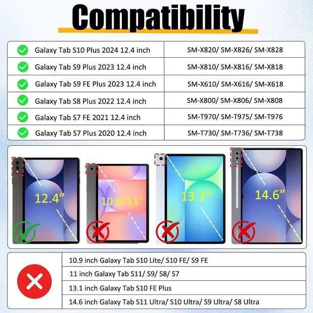 Compatibility: The Shockproof Tablet 12.4 inch Case only designed for Samsung Galaxy Tab S10+ Plus 2024 (Model: SM-X820/ X826/ X828), Samsung Galaxy Tab S9 FE+ Plus 2023 (Model: SM-X610/X616/X618), Samsung Galaxy Tab S9+ Plus 2023 (Model: SM-X810/X8016/X818), Samsung Galaxy Tab S8+ Plus 2022 (Model: SM-X800/X806/X808), Samsung Galaxy Tab S7 FE 2021 (Model: SM-T730/T733/T736/T738) and Samsung Galaxy Tab S7+ Plus 2020 (Model: SM-T970/T976/T978).