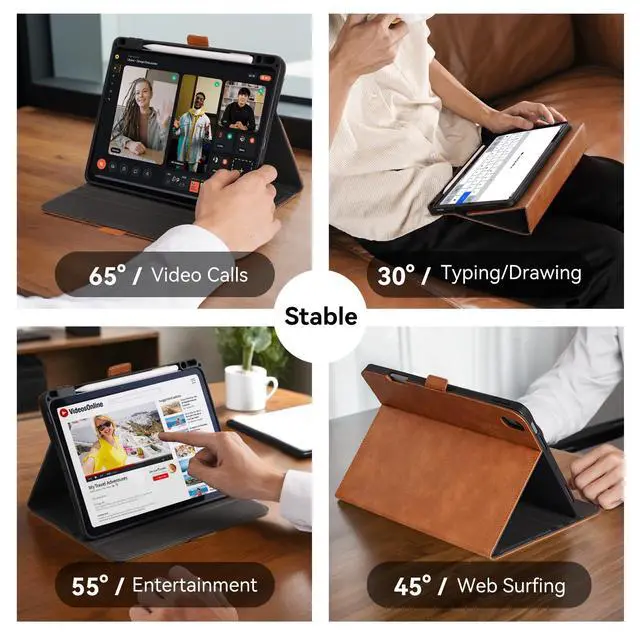 Handcrafted & Premium Material: Each case is meticulously handmade with high-quality vegan leather that resists scratches and fingerprints, skill artisans pour hours into every stitch, fold and finish. Subtle variations in texture and stitching make each cover unique. The back cover is made of flexible TPU, easy to install/remove and never break ^^ Stable Multi-Viewing Angles & Typing Angle: Featuring 3 adjustable angles, this case allows hands-free viewing movies, web browsing and video chatting, it can be folded to an ergonomic typing/drawing angle, reducing wrist strain. Anti-slip microfiber and deepened grooves ensure stability in every position ^^