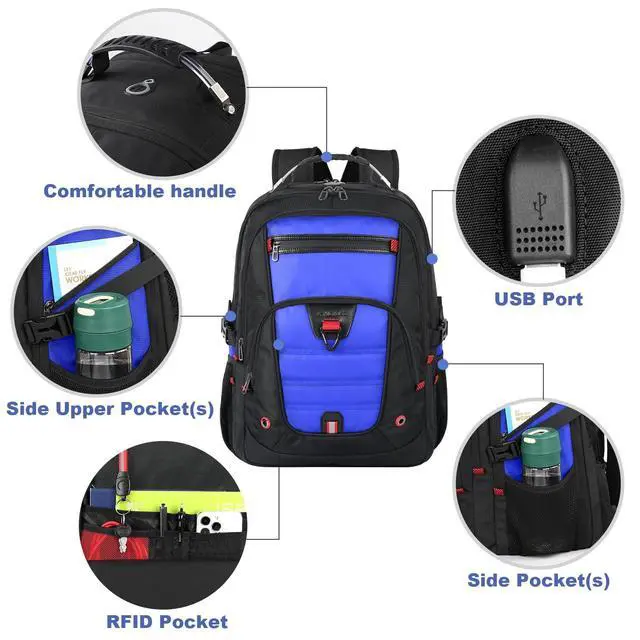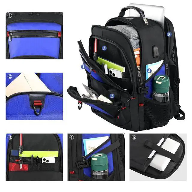 Multi-Pockets: Our waterproof laptop bag backpack has 3 spacious compartments and 18+ pockets which can provide roomy space for your computer, notebook, iPads, power bank, passport, wallet, clothes and more items. Functional front pocket has many small pockets. The personal item travel bag has a sturdy handle on top. A hole in the big travel backpack is used for the outside of the earphone. As a backpack for men women/travel carry on backpack/airlines personal item bag, you will enjoy it ^^