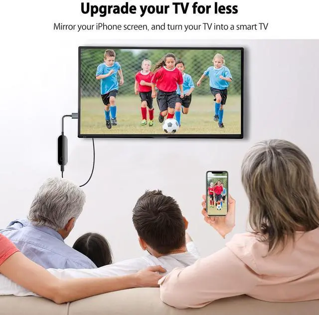 [Easy Connection] This wireless TV adapter requires no app and is easy to set up. And this upgraded wireless dongle supports mobile cellular connection, you can easily enjoy the big screen no matter at home or traval outside. Also with this wireless design, You are free to charge your iPhone as you need without worring about the low battery during screen mirroring.
