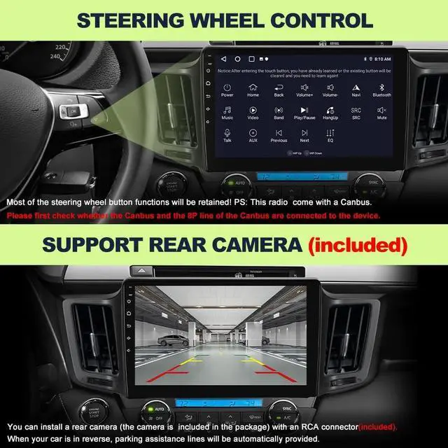 ^^ Reverse Assist: Connect an AHD720P/CVBS rear camera (included) via the RCA port. When reversing, guidance lines will be displayed on the screen. Compatible with original reversing radars (modified radars are not supported).