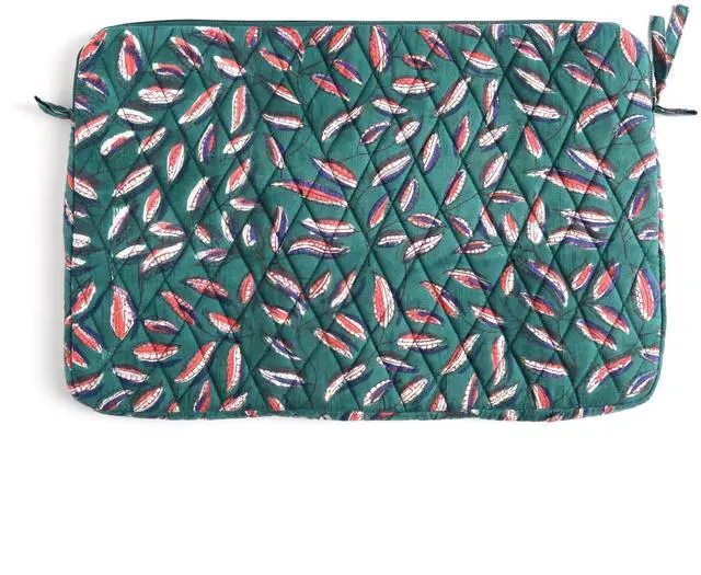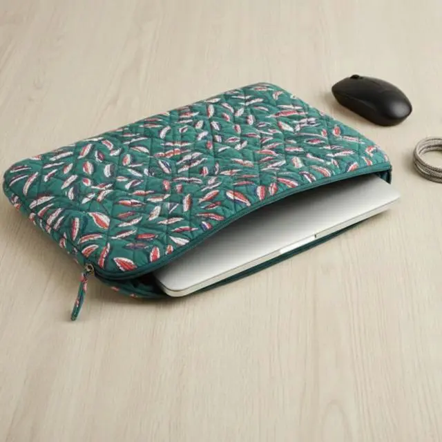Handblock Quilted Laptop Sleeve for Women 13-14 Inch Soft Padded Floral Fabric Laptop Case, Lightweight Handmade Protective Cover for Laptop & Tablets (Emerald Leaf Whisper)
