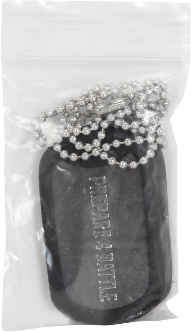 Includes: 2 dog tags on a single, 24" long, #3 ball chain poly bagged and bulk shipped.