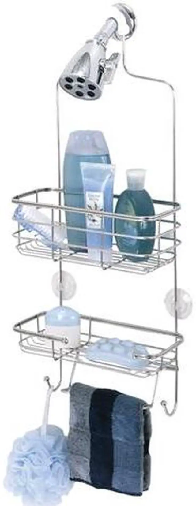 Zenith Stainless Steel Shower Caddy - 2 self draining, wire shelves with versatile design to hold various size bottles, soaps, razors, washcloths, and more. Attaches to most shower heads with included PVC grip and suction cups. - Material: Stainless Steel, Width: 10.38", Height: 24.75", Depth: 4.75", Color: Stainless Steel, Pkg Qty: 1, Package Type: Hang Tag