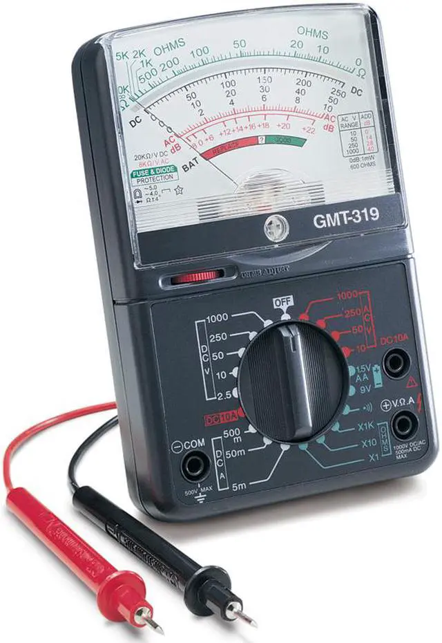 Gardner Bender 7-Function Analog Multimeter - 7-function, 19 range analog multi-tester. Tests: AC voltage 0-10-50-250-750V; DC voltage 0-2.5-10-50-250-1000V; DC current to 200MA DC; resistance to 10 Meg ohms; decibels from -8 to +62dB on the AC volt range. Tests 1.5V and 9V batteries on a separate scale. 2 test leads, (2) AA batteries and instruction manual included. Carrying handle can be used as a bench stand. UL (Underwriter's Laboratories) listed. 1 year limited warranty. 1 per card. Uses a Bussmann Model - Functions: 7-Function, Type: Analog, Voltage: 750V AC, 1000V DC, Current: 200MA DC, Power Source: (2) AA Batteries, Batteries Included: Yes, Pkg Qty: 1, Package Type: Clamshell WARNING: This product can expose you to chemicals including DEHP which is known to the state of California to cause cancer and birth defects or other reproductive harm. For more information go to www.P65Warnings.ca.gov -