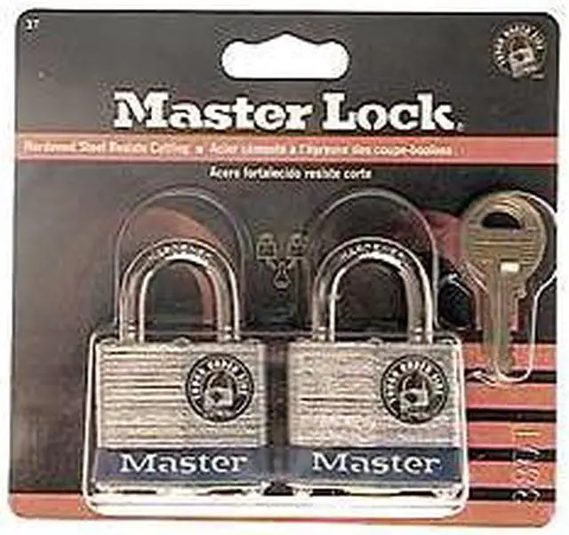 Master Lock 1-9/16 In. Wide Keyed Padlock - 1-9/16 In. W. laminated case.4-pin cylinder helps prevent picking. Dual ball bearing locking for maximum pry resistance. Hardened steel shackle for extra cut resistance. 2 brass keys. Only SKUs with KA in the model number are keyed alike padlocks and all items ordered from that SKU number would be keyed alike to the 4-digit key number shown in the product description. - Type: Keyed Alike, Body Width: 1-9/16", Body Material: Laminated Steel, Shackle Dimensions: 3/4" x 5/8" x 9/32", Shackle Diameter: 9/32", Shackle Horizontal Clearance: 5/8", Shackle Vertical Clearance: 3/4", Locking Mechanism: 4-Pin Tumbler, Pkg Qty: 2, Package Type: Clamshell