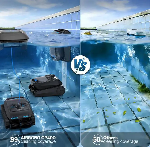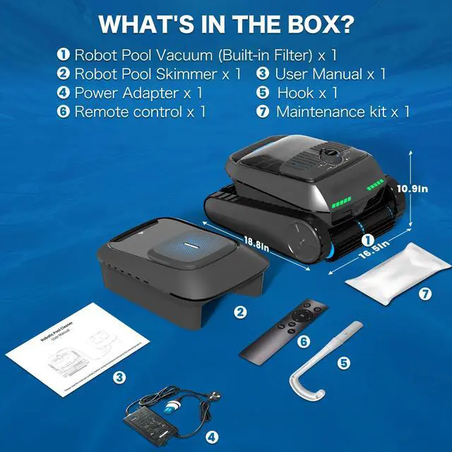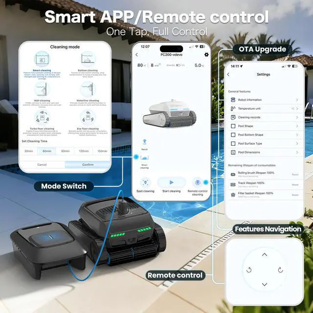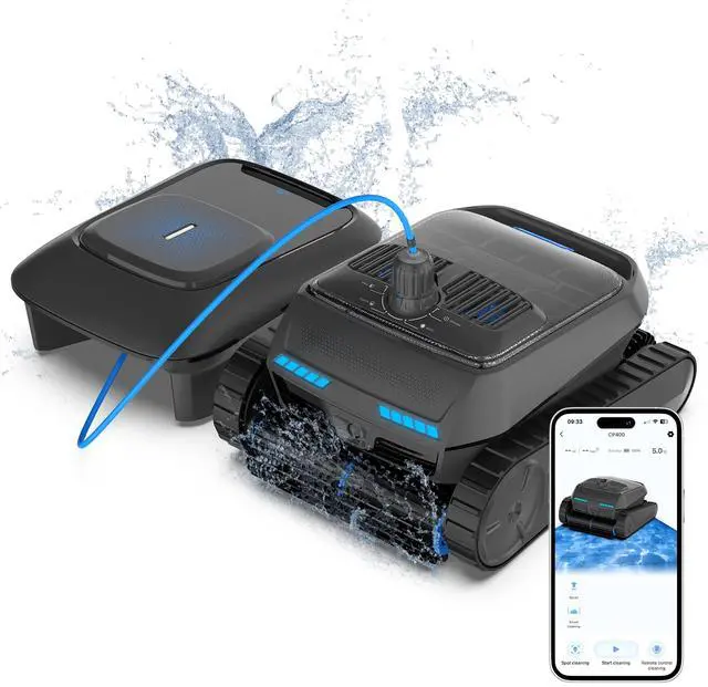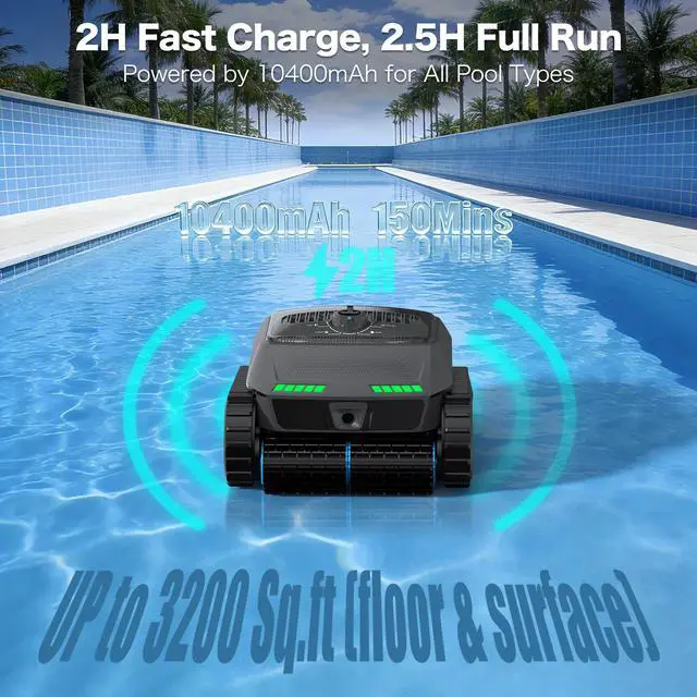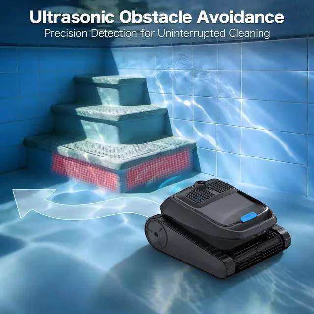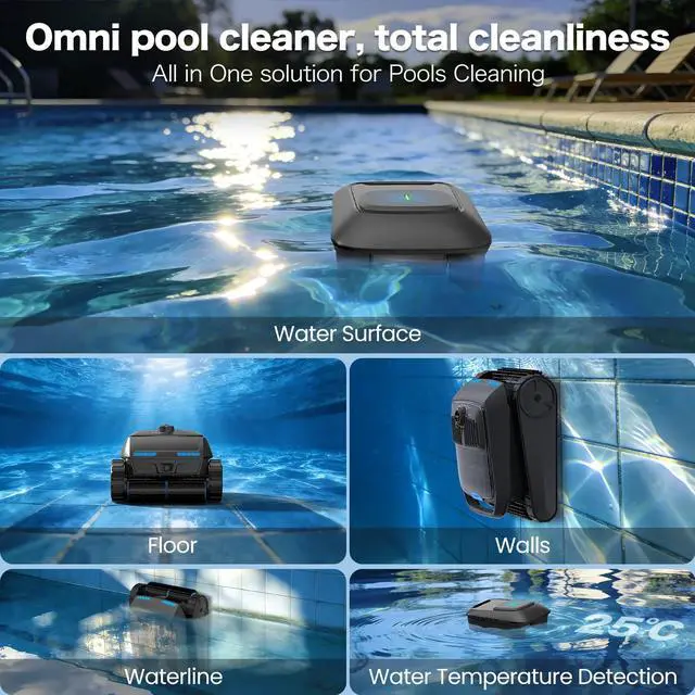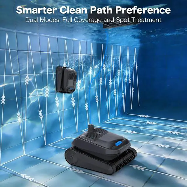 | Features | Cordless Freedom & Long Runtime: Enjoy 150 minutes of cordless cleaning on a single charge (10400mAh battery). Fast charging ready in ~2 hours. IP68 waterproof. Advanced Waterline Cleaning: Specialized function targets and removes dirt, algae, and oils at the water surface/wall intersection. Smart Navigation & Control: Uses NaviClean™ technology with positioning sensors and smart algorithms for efficient zigzag path planning. Control via mobile app or Bluetooth remote. All-Pool Cleaning Master: Cleans floors, walls, waterline, and surface. Climbs walls up to 90° and works on all surfaces (PVC, tile, mosaic, glass) Strong Cleaning Performance: Features 4 motors (2 drive + 2 water pump) and 4 high-grip PVC brushes for powerful suction, removing sand, leaves, and stubborn debris. Intelligent Features: Automatic obstacle avoidance (ultrasonic), water detection, temperature monitoring, and auto-docking when finished or battery low. Large Capacity & Easy Maintenance: 4L top-load filter basket captures debris effectively. Simple rinsing cleans the filter. High Efficiency: Cleans pools up to 3,229 sq ft and 9.8 ft deep. Up to 10x more efficient than traditional cleaners. |