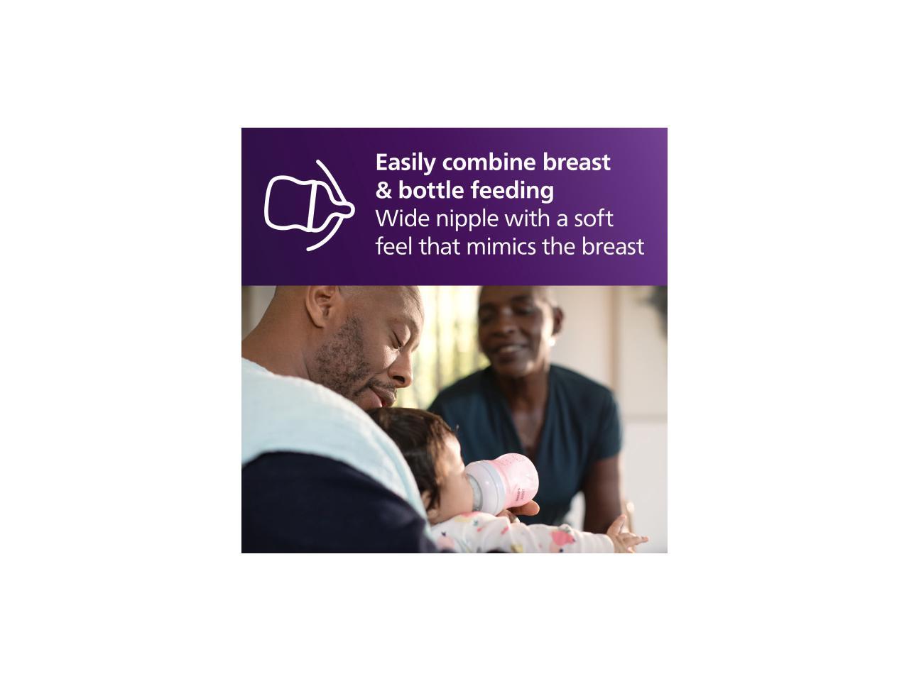 - Easy to combine breast and bottle feeding with a wide breast-shaped nipple with a soft feel that mimics the shape and feel of a breast and baby controlling the flow of milk.