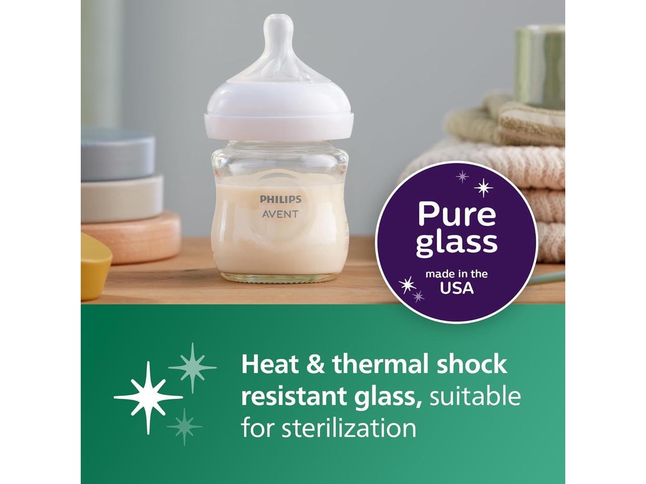 - This Natural Philips Avent bottle is made of premium quality borosilicate glass, a BPA free material. It is heat and thermal shock resistant, so it can be safely stored in the fridge, warmed and is easy to wash and sterilize