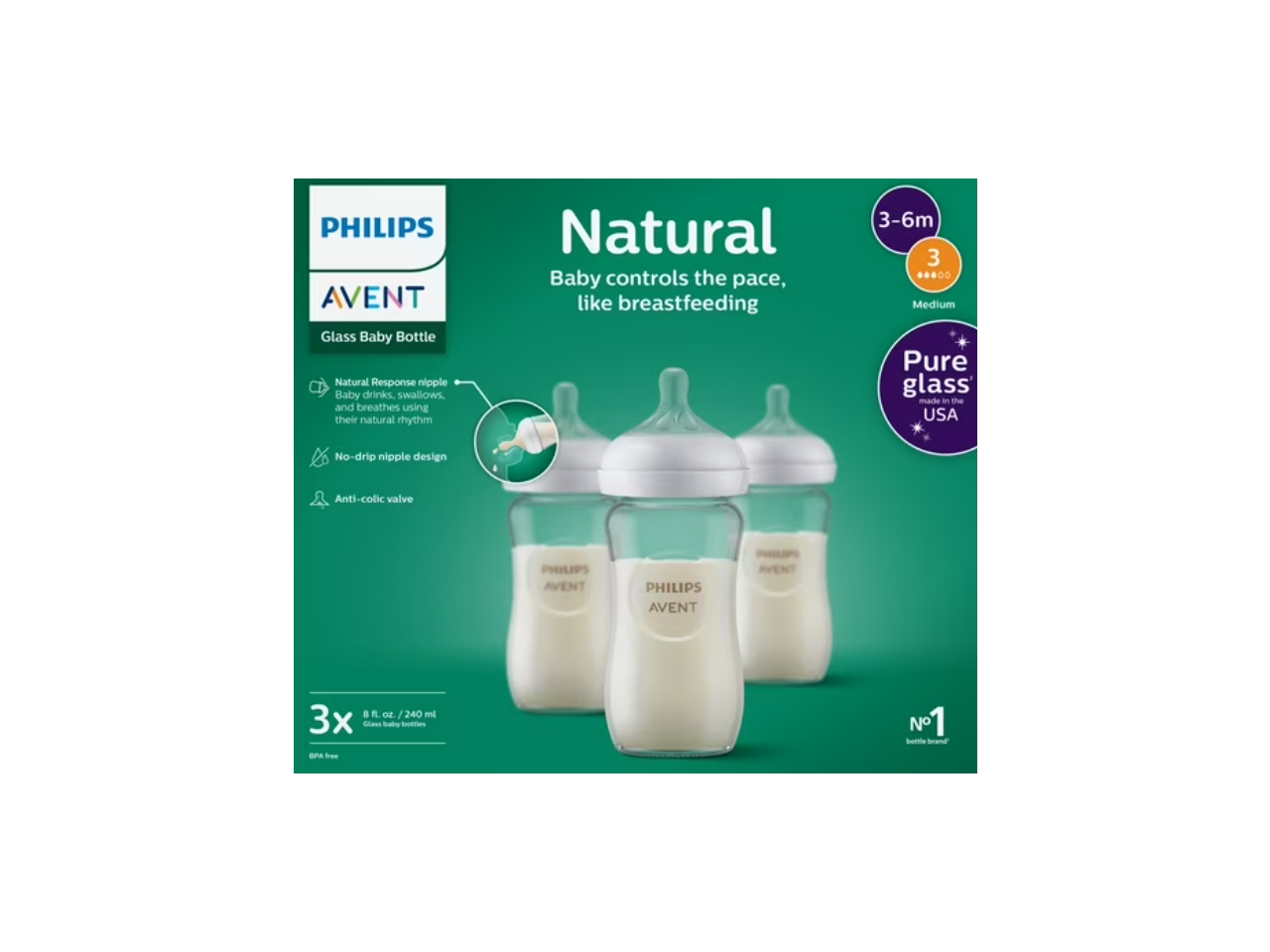 Philips Avent Natural Glass Baby Bottles with Natural Response Nipples (Medium Flow, Flow 3), 8oz, 3-pack, SCY913/03