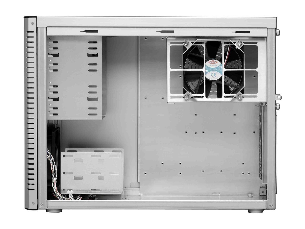 Cons: As is to be expected with a case this small, space is cramped, and with the motherboard sitting basically upside down, wires and cables kinda fly everywhere. It's a pretty big hassle to change something once everything is in place. The harddrive tray is not removable, nor does it feature removable side brackets, so you have to take off both sides of the case to get to a harddrive. And it only holds a maximum of two. You could probably shoehorn a third in there, because there are slots for the screws, but it would be weird. As for 5.25" drives, again, you have to take both sides off to get to them, as there are no removable sliders.