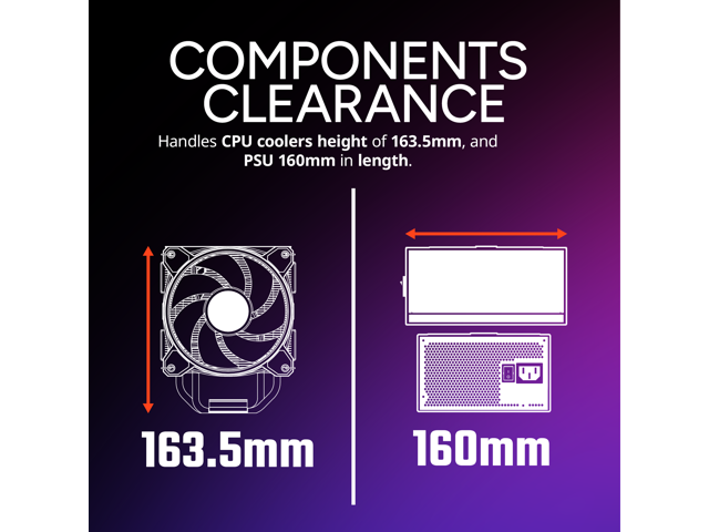 Components Clearance: Accommodate CPU coolers height of 163.5mm, and PSU 160mm in length.
