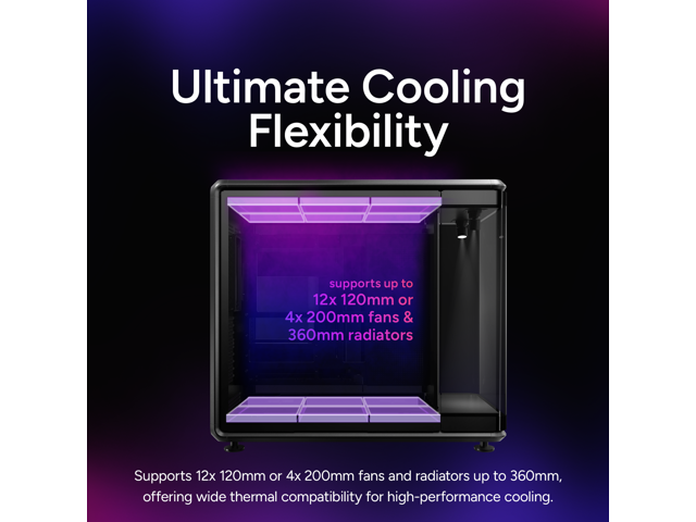 - Extreme Cooling Flexibility Supports fan sizes from 120mm to 200mm with space for up to twelve 120mm fans—six on the top and six on the bottom—plus radiator support up to 360mm for high-end custom cooling.