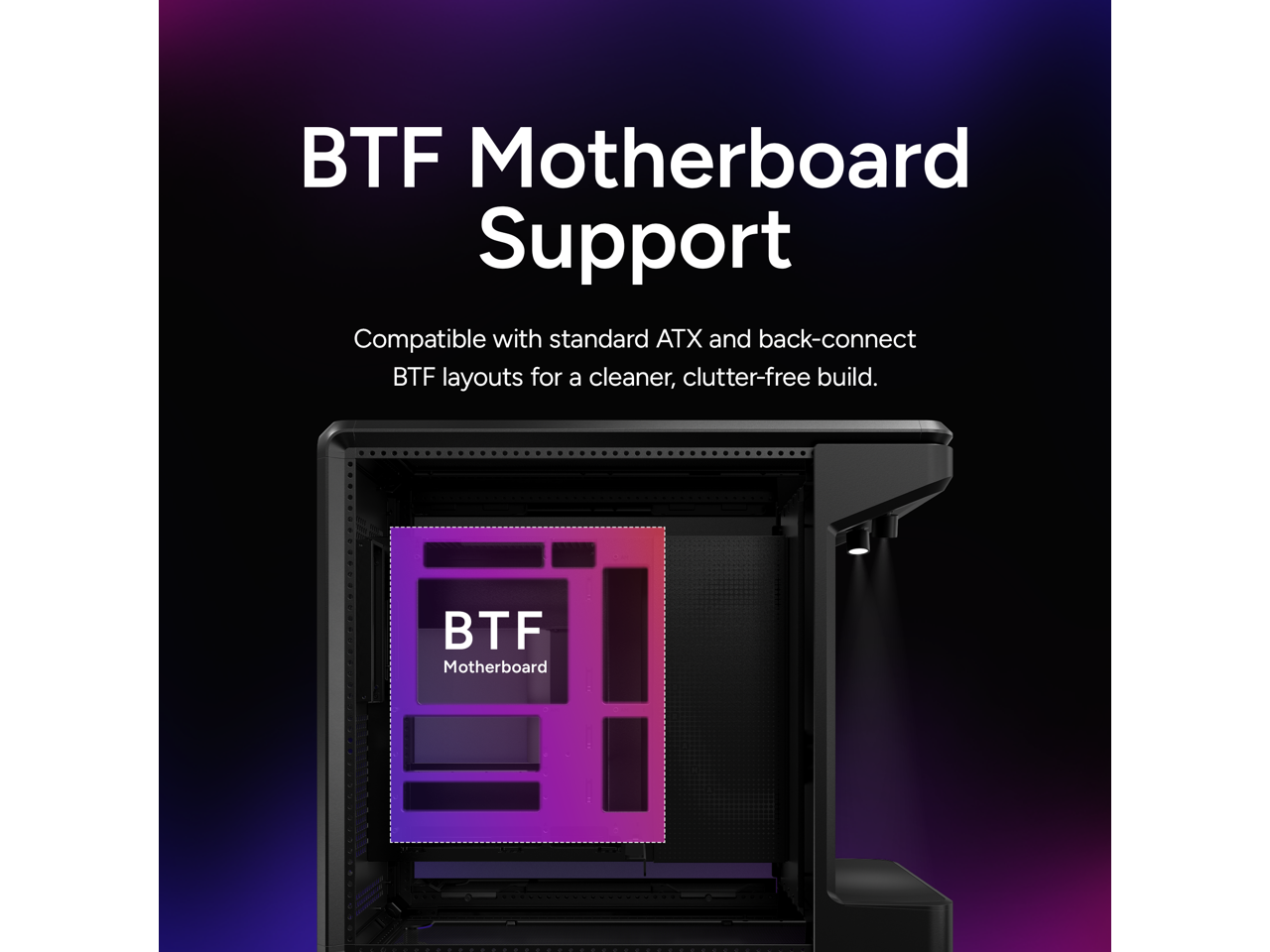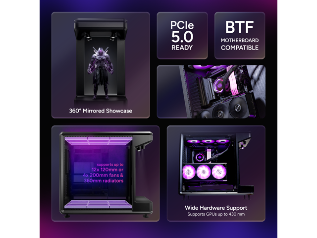 - Supports Mini-ITX, Micro-ATX, and ATX motherboards, including ATX BTF (back-connect) layouts. Accommodates GPUs up to 430mm and PSUs up to 210mm