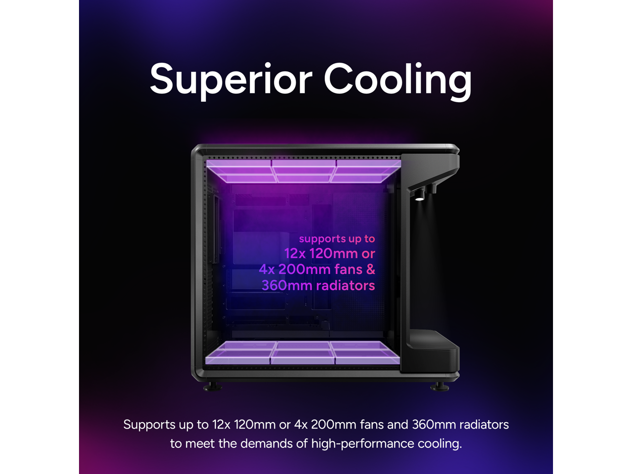 - Supports fan sizes from 120mm to 200mm with space for up to twelve 120mm fans - six on the top and six on the bottom and radiator support up to 360mm.