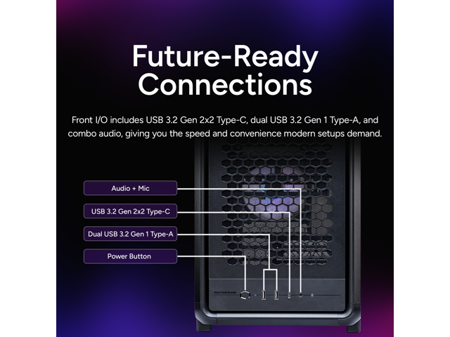 - Front I/O includes USB 3.2 Gen 2x2 Type-C, dual USB 3.2 Gen 1 Type-A, and combo audio, giving you the speed and convenience modern setups demand.