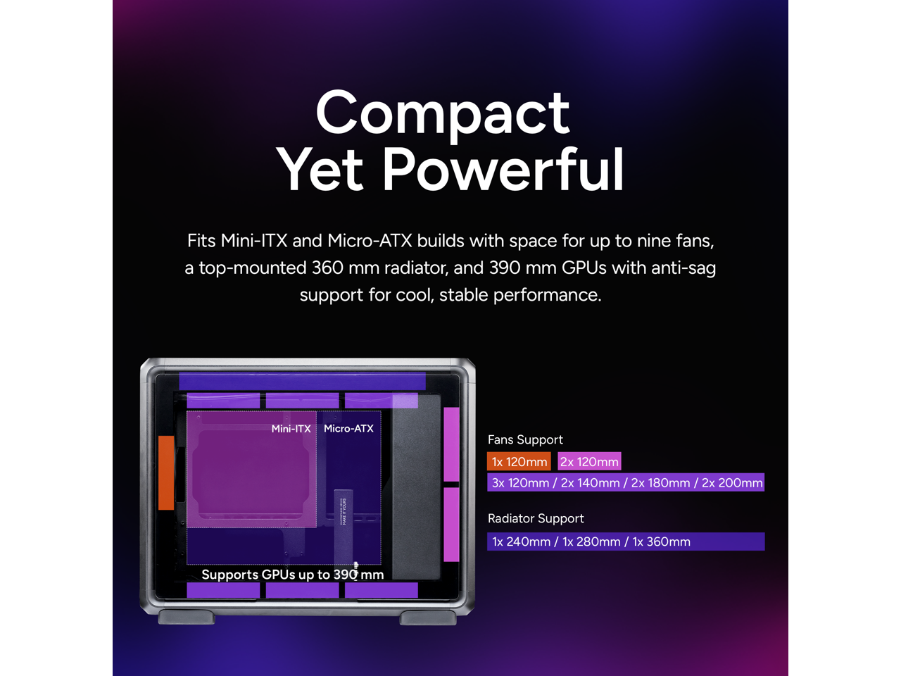 - Fits Mini-ITX and Micro-ATX builds with space for up to nine fans,