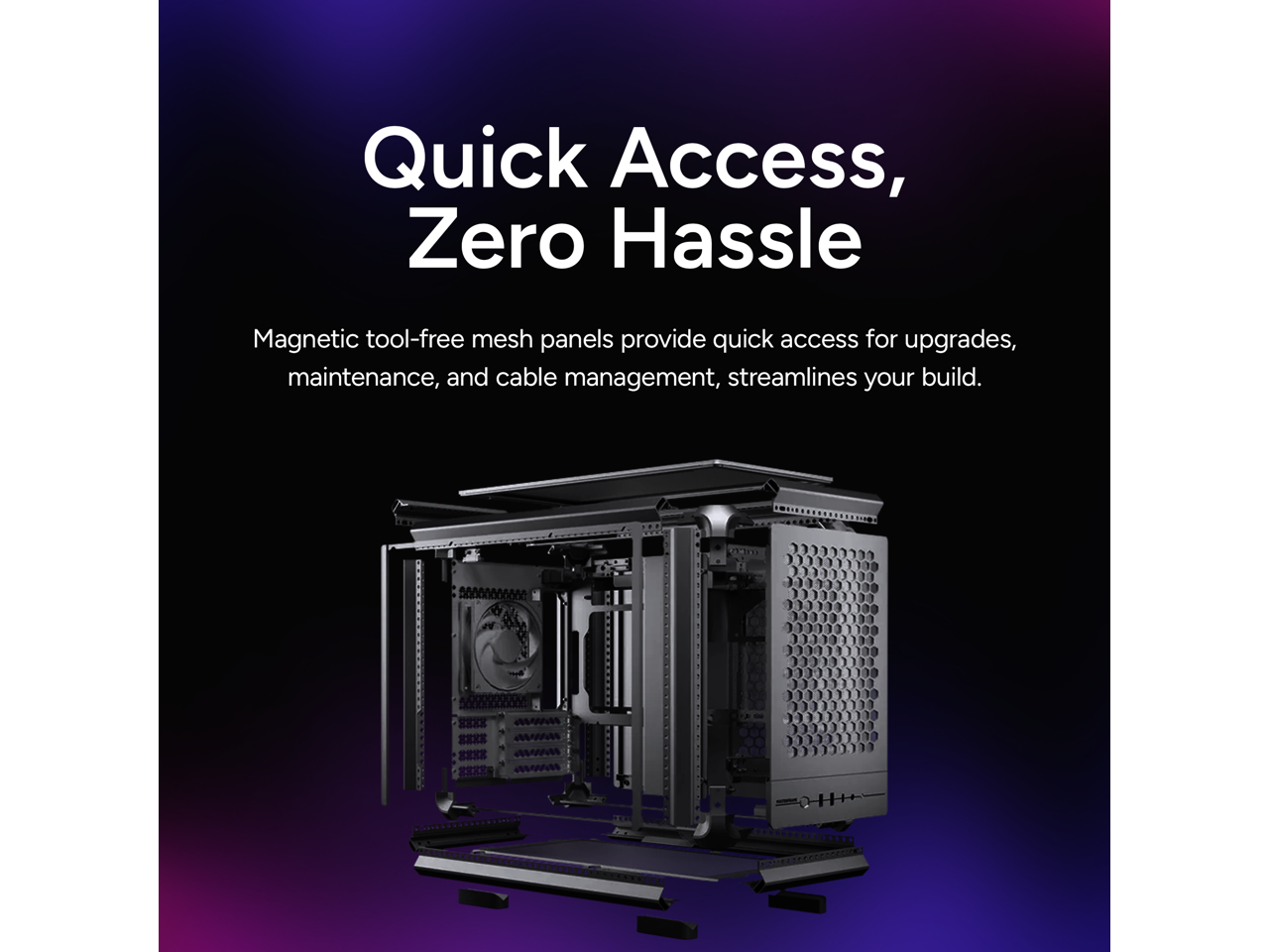 - Magnetic tool-free mesh panels provide quick access for upgrades, maintenance, and cable management, streamlines your build.