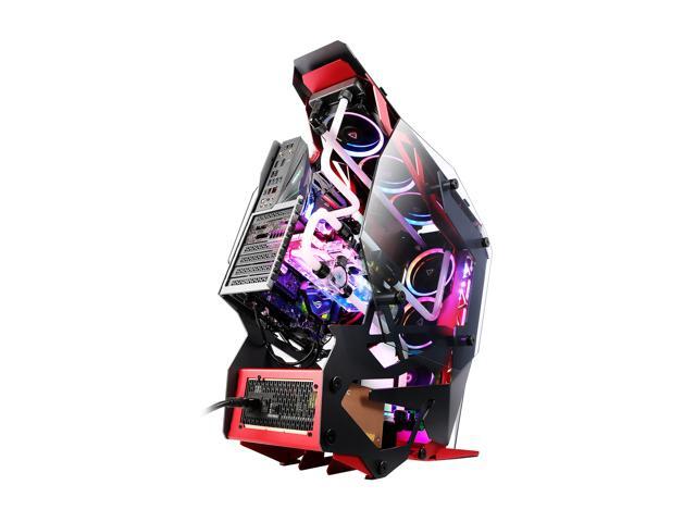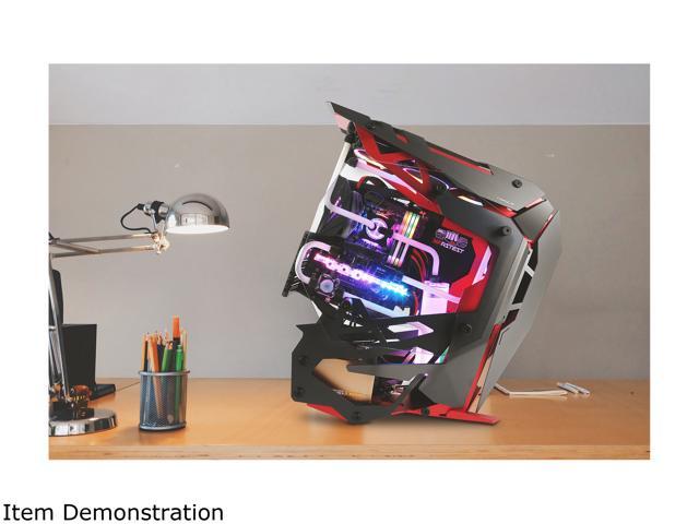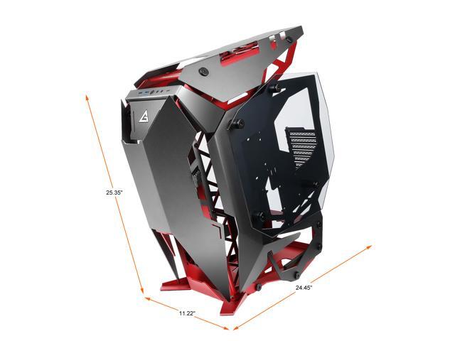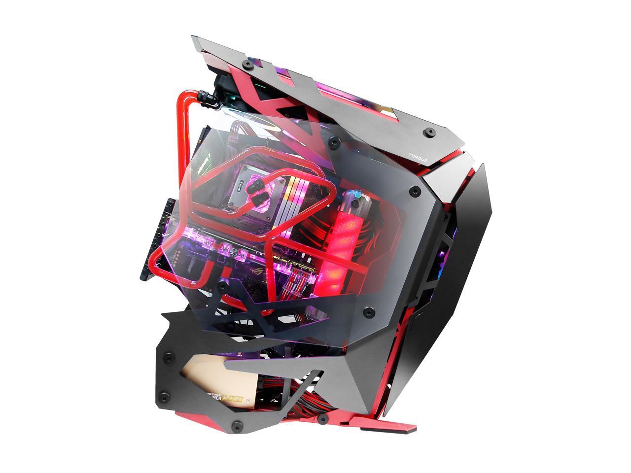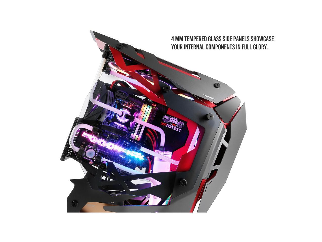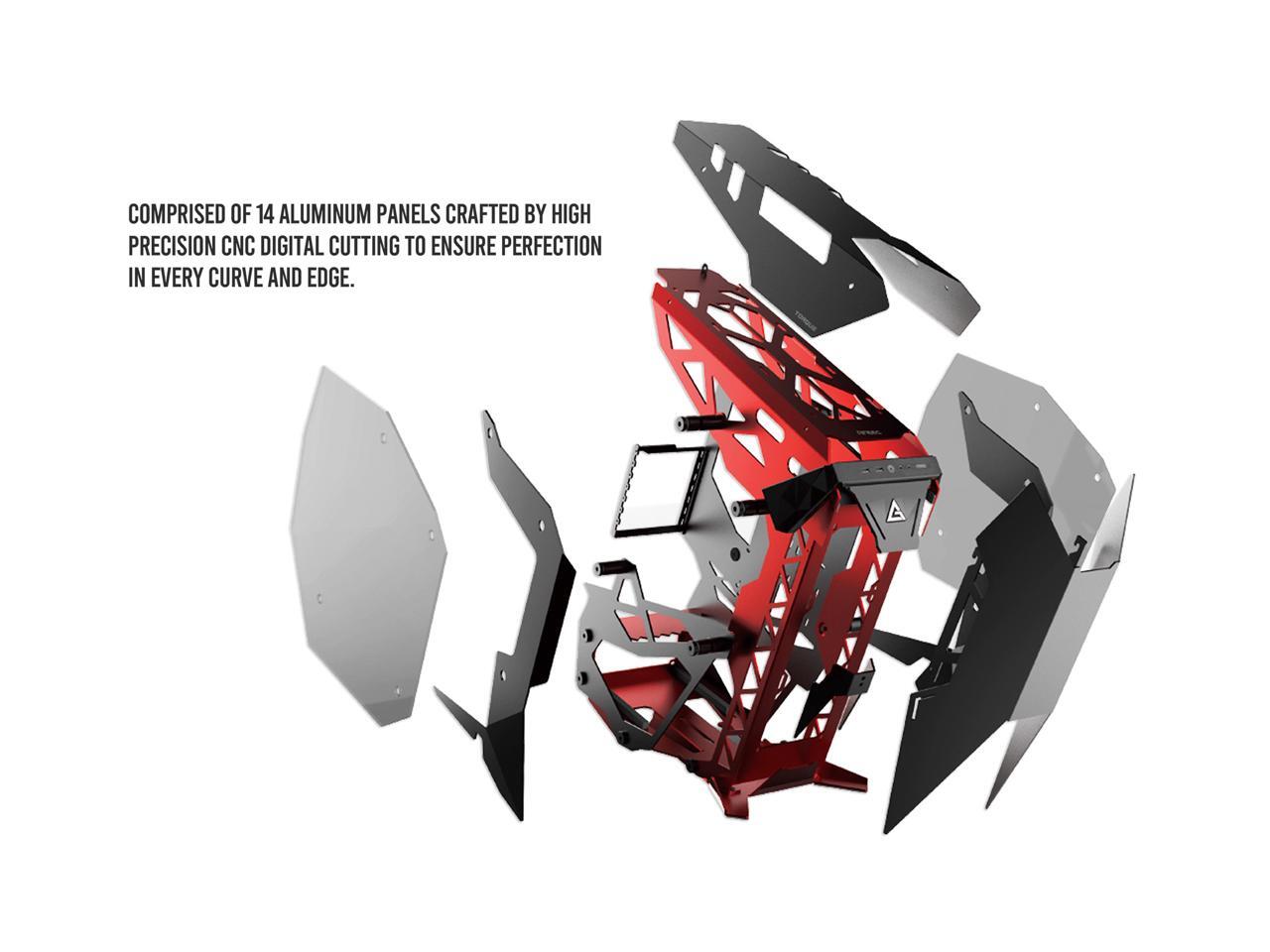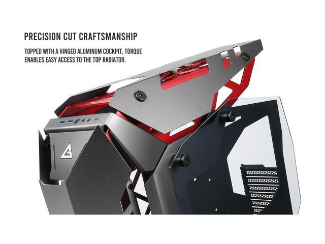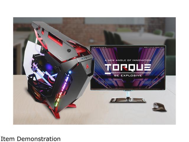 Torque, a commanding mid tower with a forward-tilted motherboard position, aggressive lines, and plenty of features designed for performance-heavy builds, merges precision cut aluminum panels in high contrast crimson and gunmetal to bring an augmented experience to your desktop.