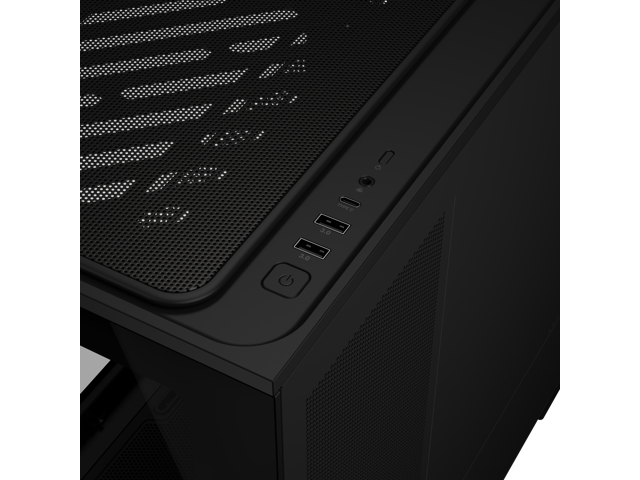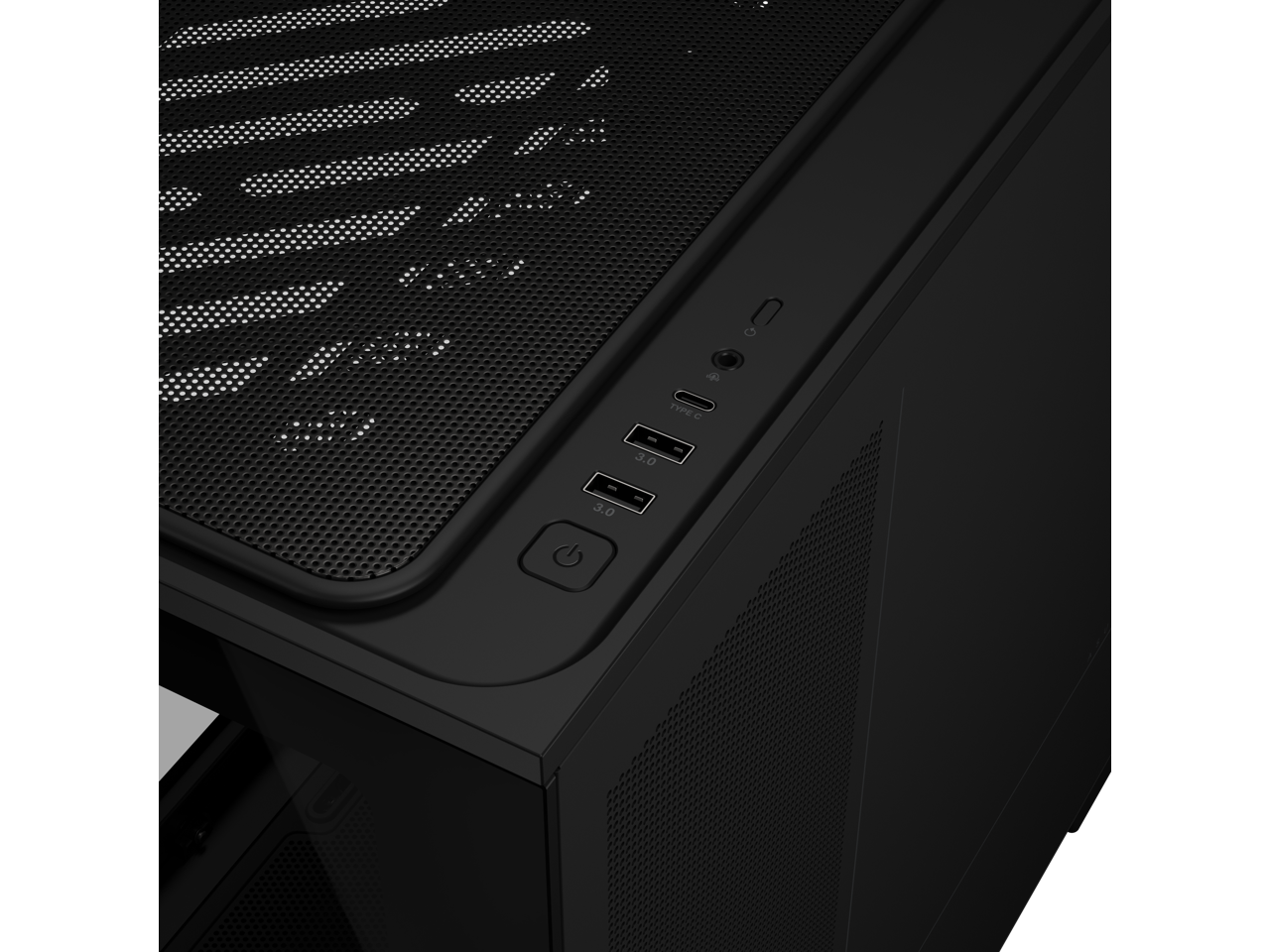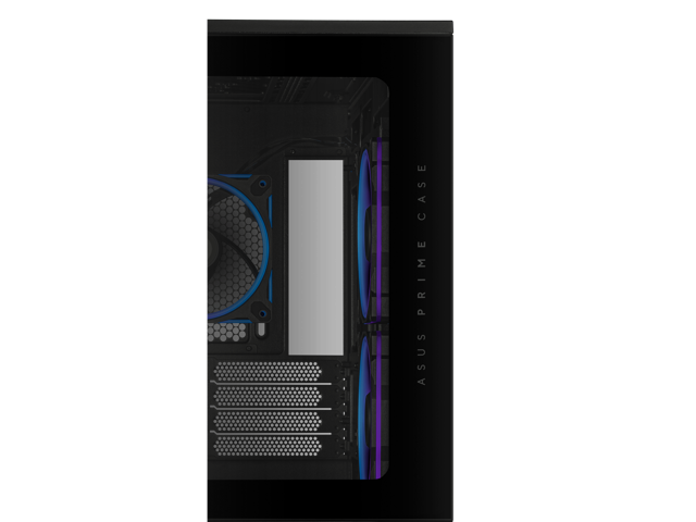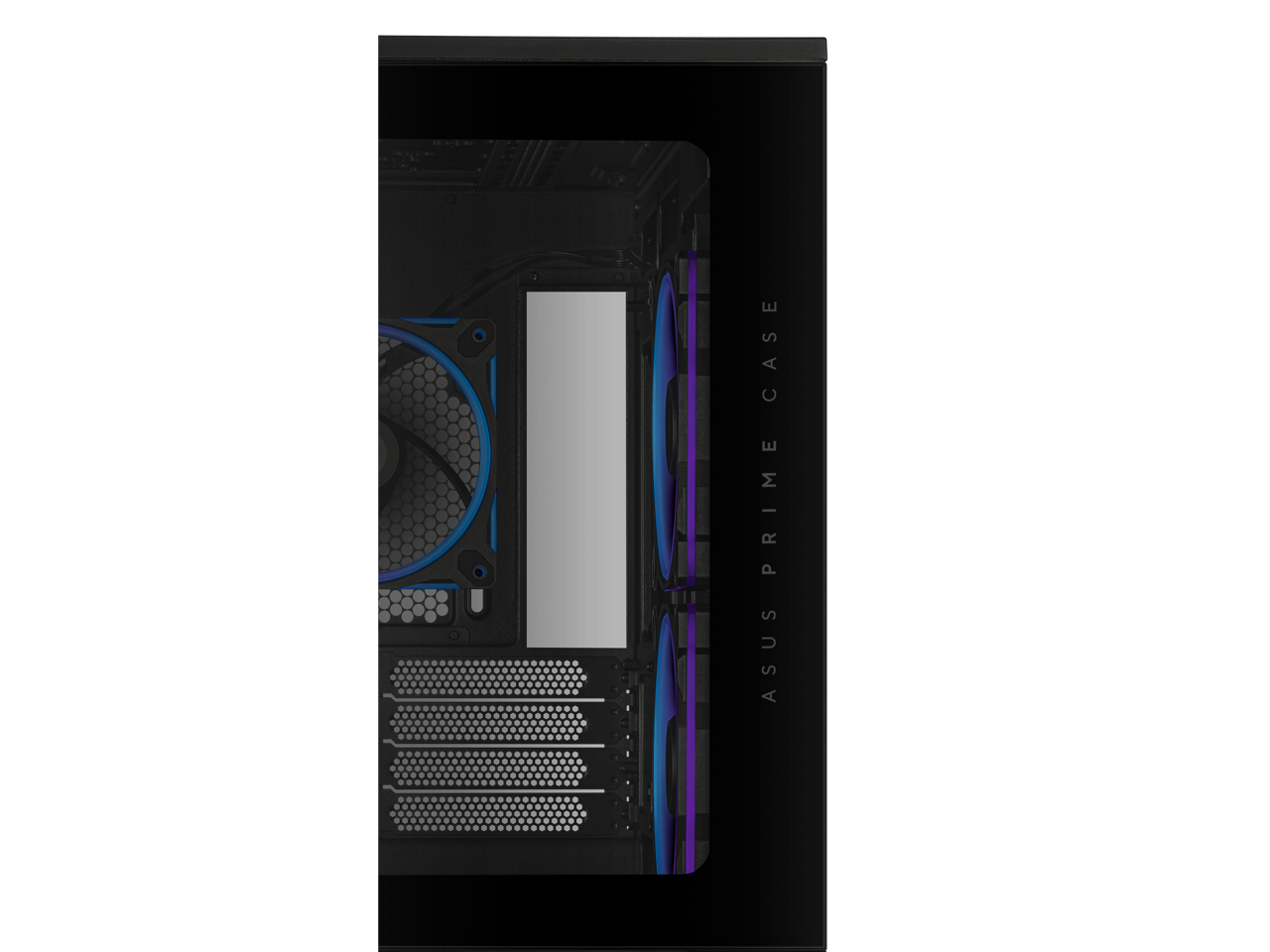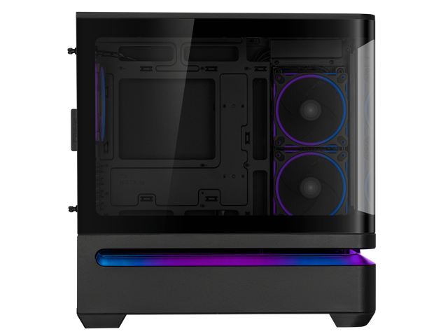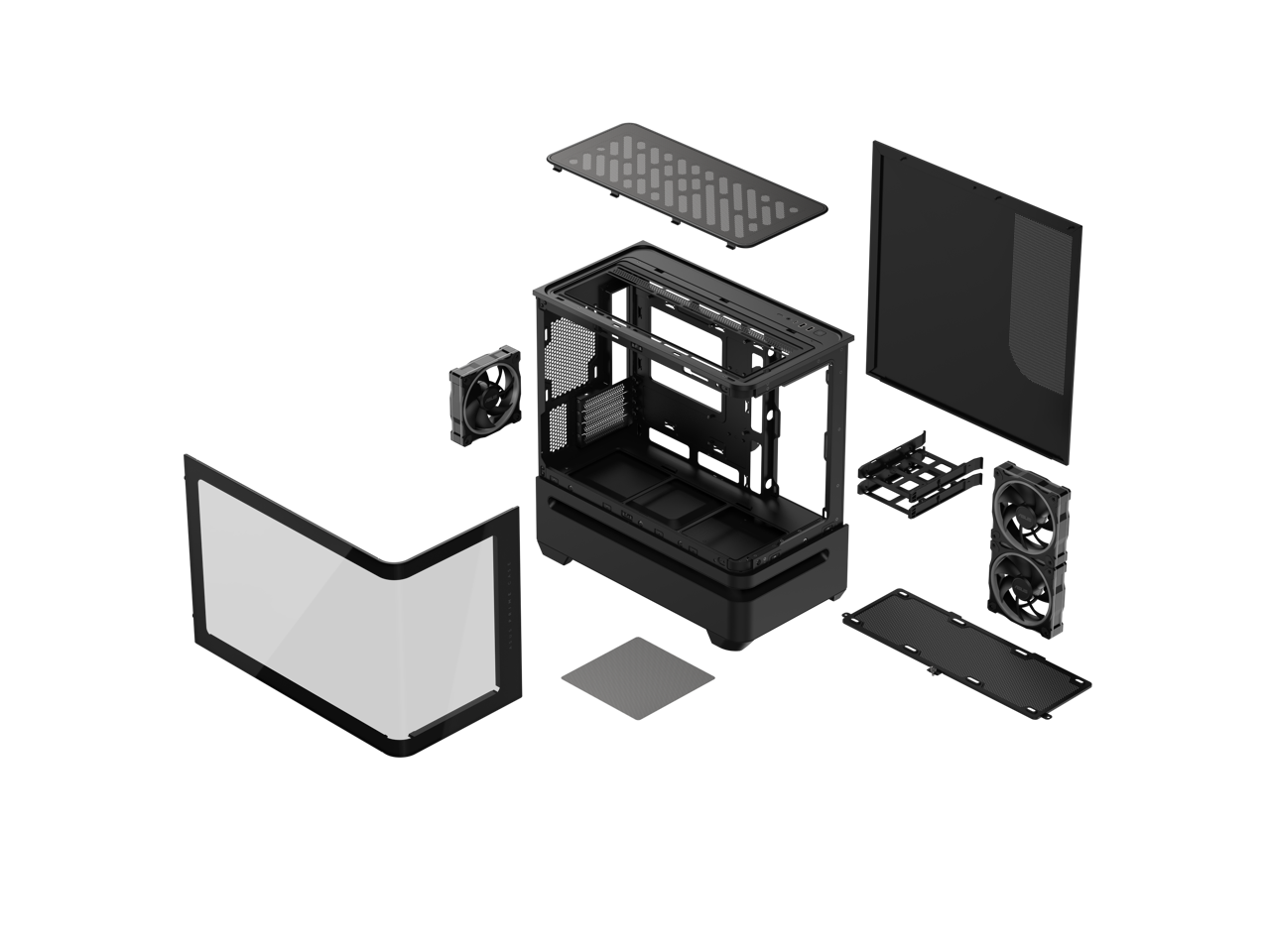 - Curved tempered glass panel extends seamlessly from the front to the side, offering a panoramic view of the components from almost any angle