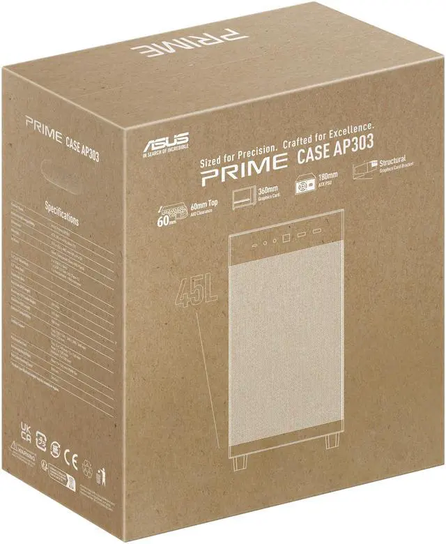 The ASUS Prime AP303 is a compact 44-liter ATX chassis that accommodates 360mm radiators up to 60mm thick and graphics cards up to 360mm long. It features a graphics card bracket and holder to keep cards firmly mounted, plus an internal power cable that delivers 15 amperes to maintain stable power delivery for high-end PC builds.