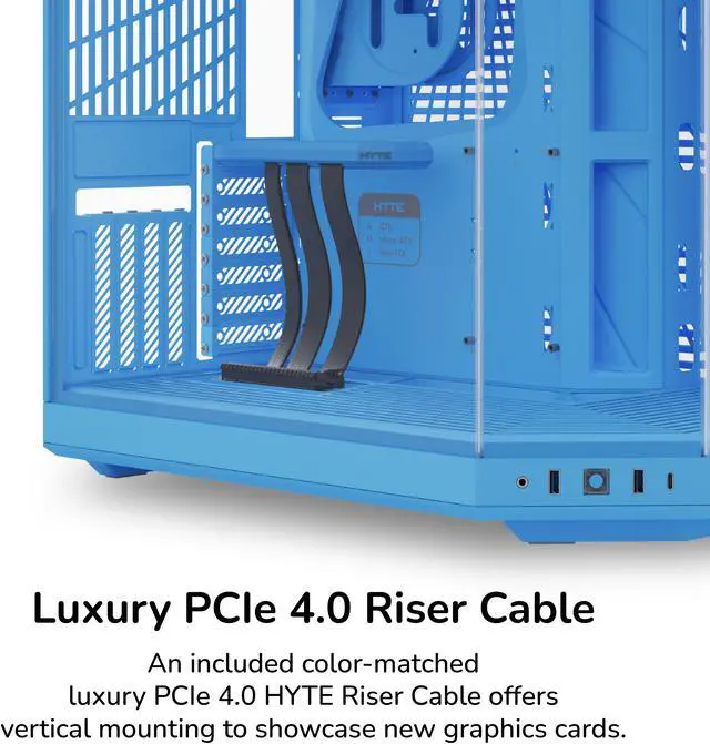 Massive 4 Slot Vertical GraphicsY70 grows GPU support to 4 slots with additional airflow space between the edge of the card and the glass. This means you can fit even the largest and most powerful of graphics cards into your build with ease. Additionally, the cold floor cooling down below can house up to a trio of 120mm or duo of 140mm fans up to 32mm thick to direct fresh airflow straight into the GPU. Included Luxury PCIE 4.0 Riser CableIncluded with the case is a luxury PCIE 4.0 x 16 riser with a color-matched canopy for uninterrupted visual flow that'll make for a painless GPU installation and build process.