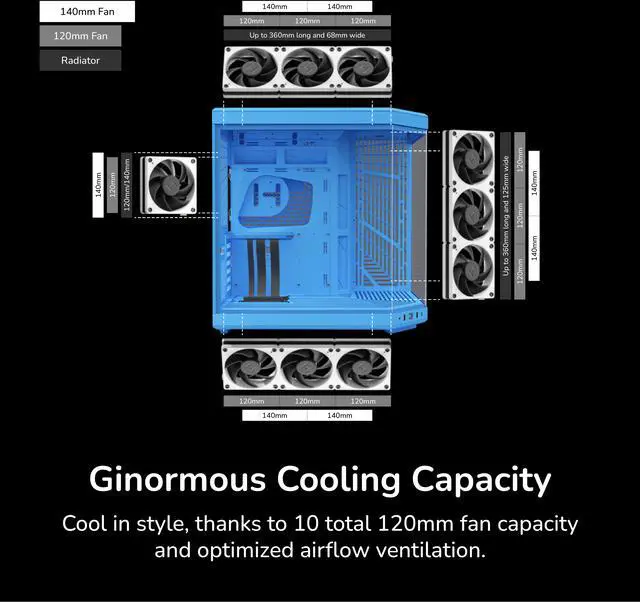 It also allows for a plethora of half-height PCIE cards to sit behind the throne of the vertical graphics. Ginormous Cooling CapacityA spacious interior makes room for up to a 360mm long & 125mm thick radiator on the side and adjustable top bracket that can house another 360mm radiator up to 68mm thick up above. Working together with the cold floor cooling at the bottom and spot for an additional fan at the rear of the case, Y70 has a total capacity of 10 fans in a fully populated chassis. With over 180mm of clearance to the side glass, air and water cooling enthusiasts alike will appreciate the flexibility afforded to them by the chassis to create the most robust cooling configurations possible.